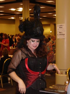 Yep. That’s none other than chapter mate Sherrilyn Kenyon/Kinley McGregor who delighted her fans with her elaborate outfit, complete with fanged teeth and green glittery eye makeup!And I didn’t see them all individually. On Thursday, I met up with the Brainstorming Desirables online group at Monduel’s (bar) in the Hyatt.