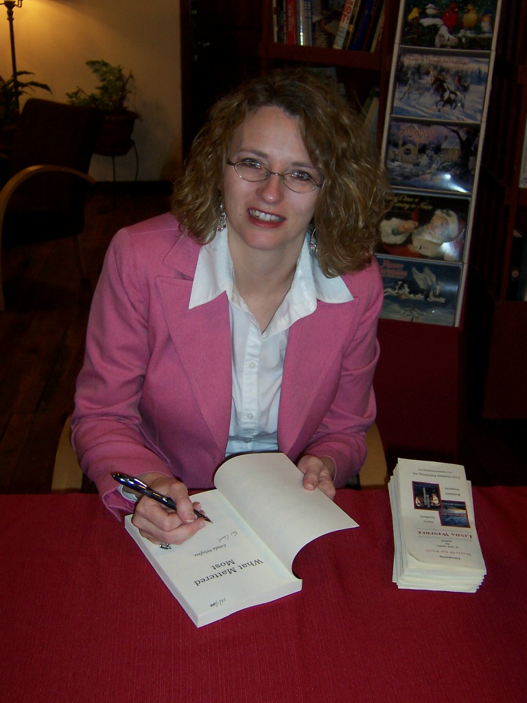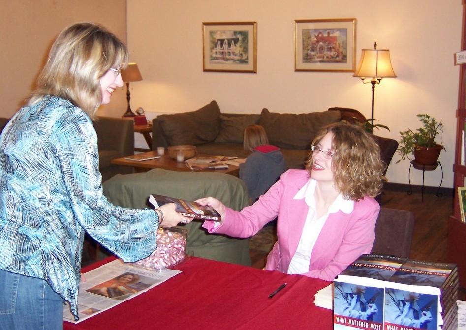 And Linda’s first booksigning was at The Bookstore, in Camilla, GA. Very cool, renovated 100-yr-old building. That’s me – handing her my copy to be signed.
