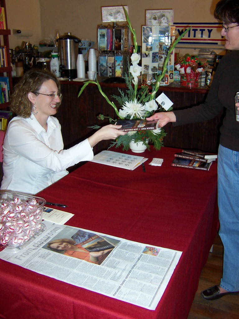 Selling completely out of the 60 (Yes SIXTY!!) copies available and having to resort to Rain Checks promising the buyer an autographed copy. Go, Linda! (See how low that pile is in the 3rd picture compared to the 2nd one?) This author did her homework, sending out press releases in advance. She had not one, but two write-ups in local papers, one of which is on her signing table.