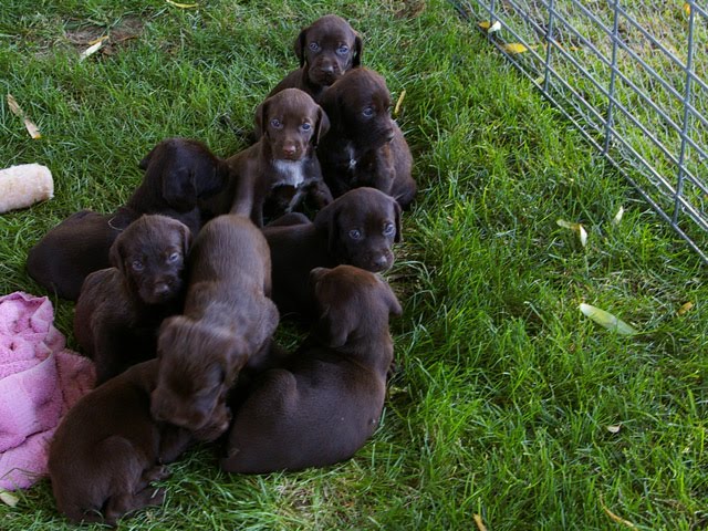 Beau (also a Pudelpointer) is 8, Murphy (A tri-color Llewellen English Setter) is 3-1/2. And then there’s the feline member of the family, Tabitha (aka ‘kitty’), who turned 15 last month. Yes, we’re probably nuts, but we’re expecting our 3rd bird-hunting dog to arrive at Dulles airport on 9/11. He’s one of the Pudelpointers in the 9-puppy litter you see in the picture, all adorable at 4 weeks.