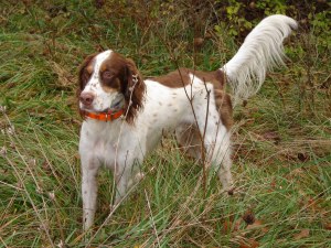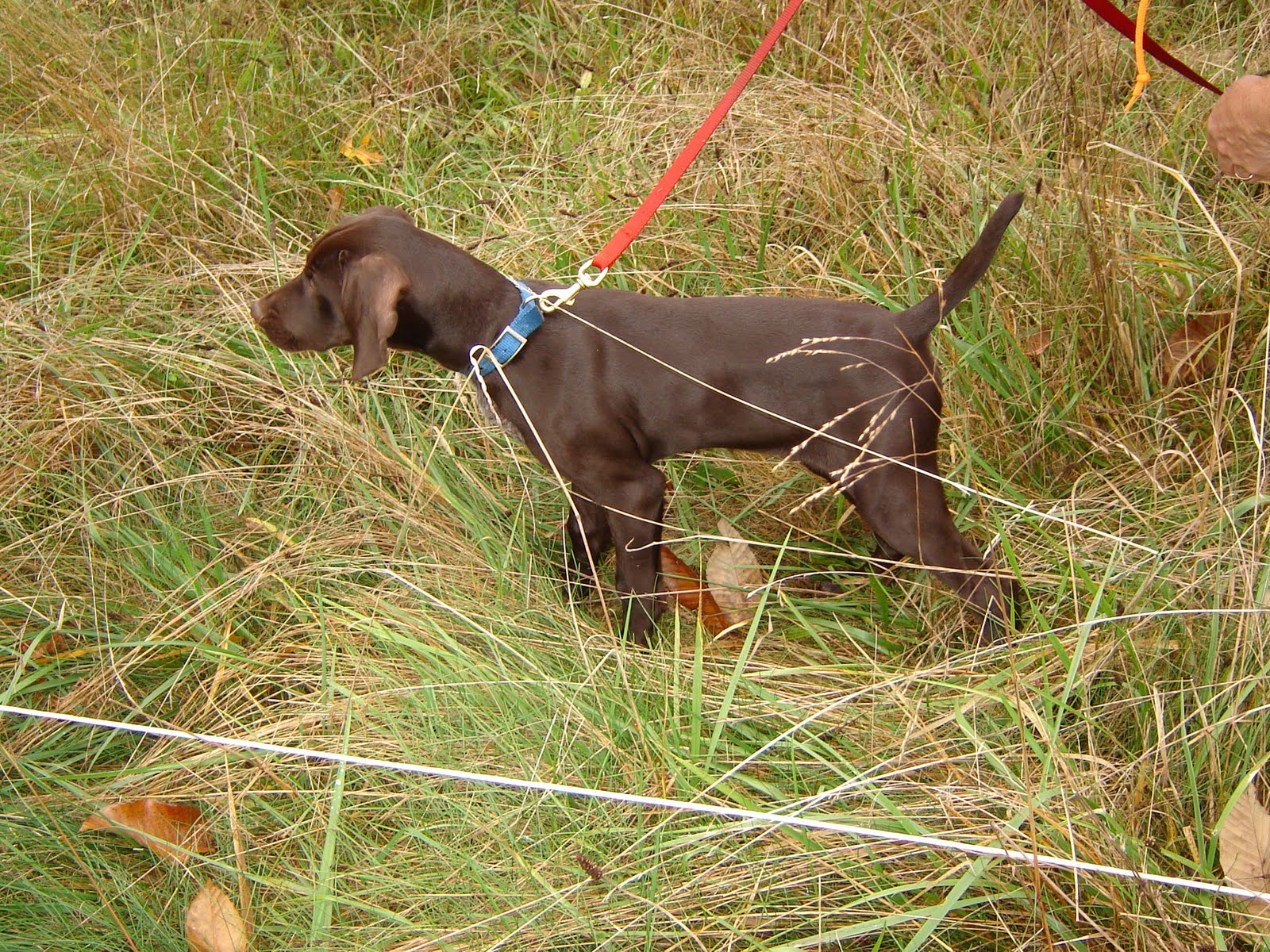 For those of you who might be concerned, the birds are tethered to a bush, but the dog isn’t allowed to get the bird. After the dog points the bird and is praised, the bird is released. 🙂