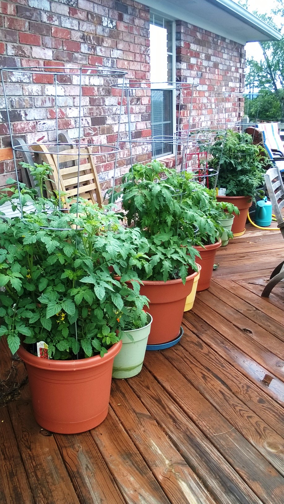 May 19th and June 2nd pictures of my tomatoes show how recent rains and applying fertilizer at transplant has affected my container tomatoes. I’m amazed at the difference and more than a little amazed at the amount of watering these will require, if current needs are any indication. God help me when it really gets hot out! One plus? I picked my first ripe fruit on May 31st. Yum!