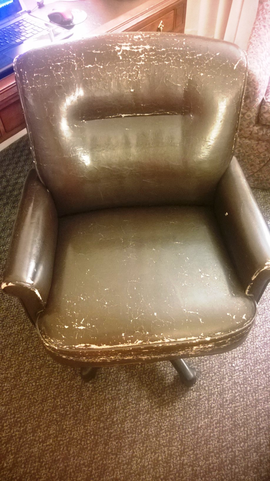 Gnarly, eh? It looks like it should be in the No Tell Motel. As if it wasn’t bad enough that it was poop brown and peeling, the pneumatic lift was broken, so it sat too low for comfortable use of the desk.