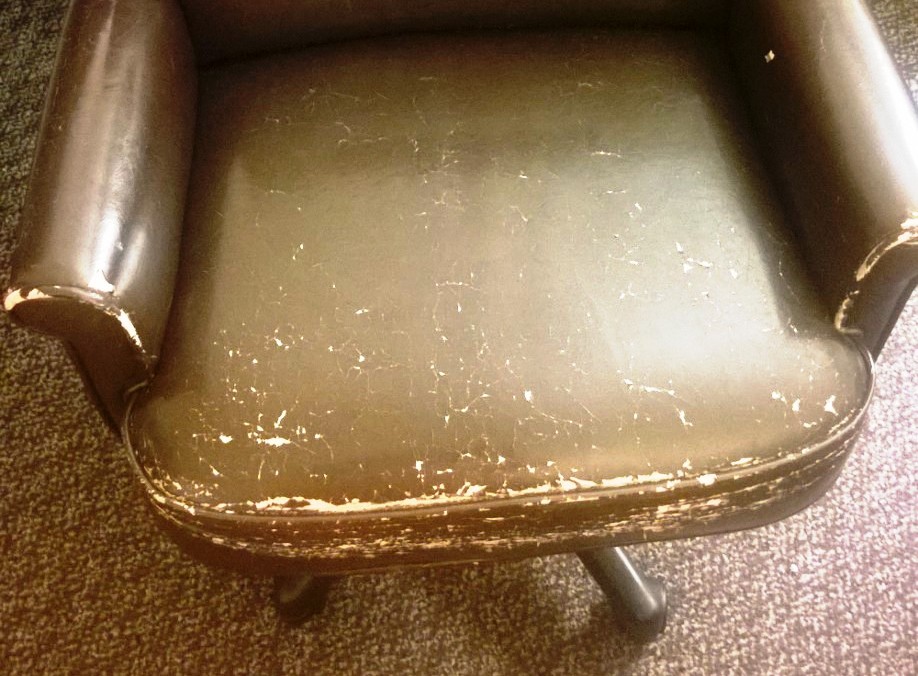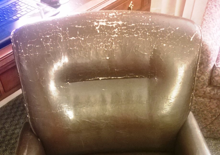 Yep, that’s one awesome chair. Dunno how much Hilton paid for these beauties, but it was too much. How long have they been there? Too long, even if it’s only a year. They’re cheap vinyl and peeling worse than a fair-skinned beauty after a beach vacation as evidenced below.